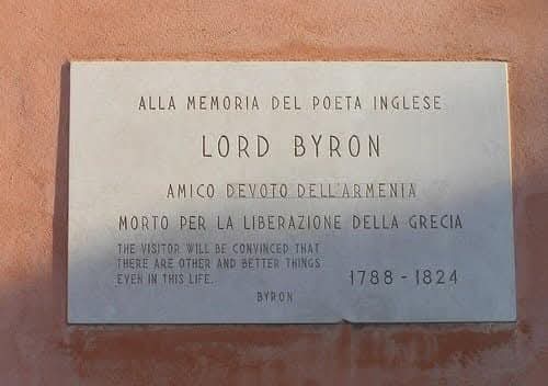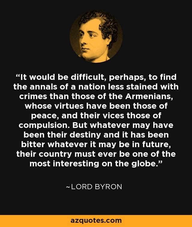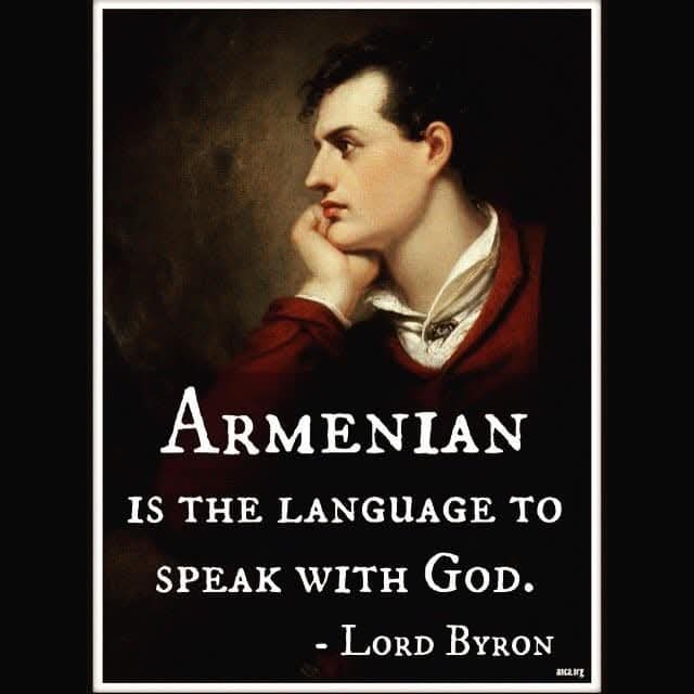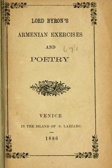 Firma en armenio de Lord Byron (1788-1824), poeta inglés del movimiento romántico, quien tenía fascinación por el idioma y la cultura armenios, los cuales estudió entre 1816 y 1817 con el sacerdote Paschal Aucher en el monasterio de la isla de San Lázaro, Venecia. Lord Byron dejó su capital económico y su vida a los 36 años de edad como voluntario en la guerra por la independencia del imperio otomano en Grecia. ![]()